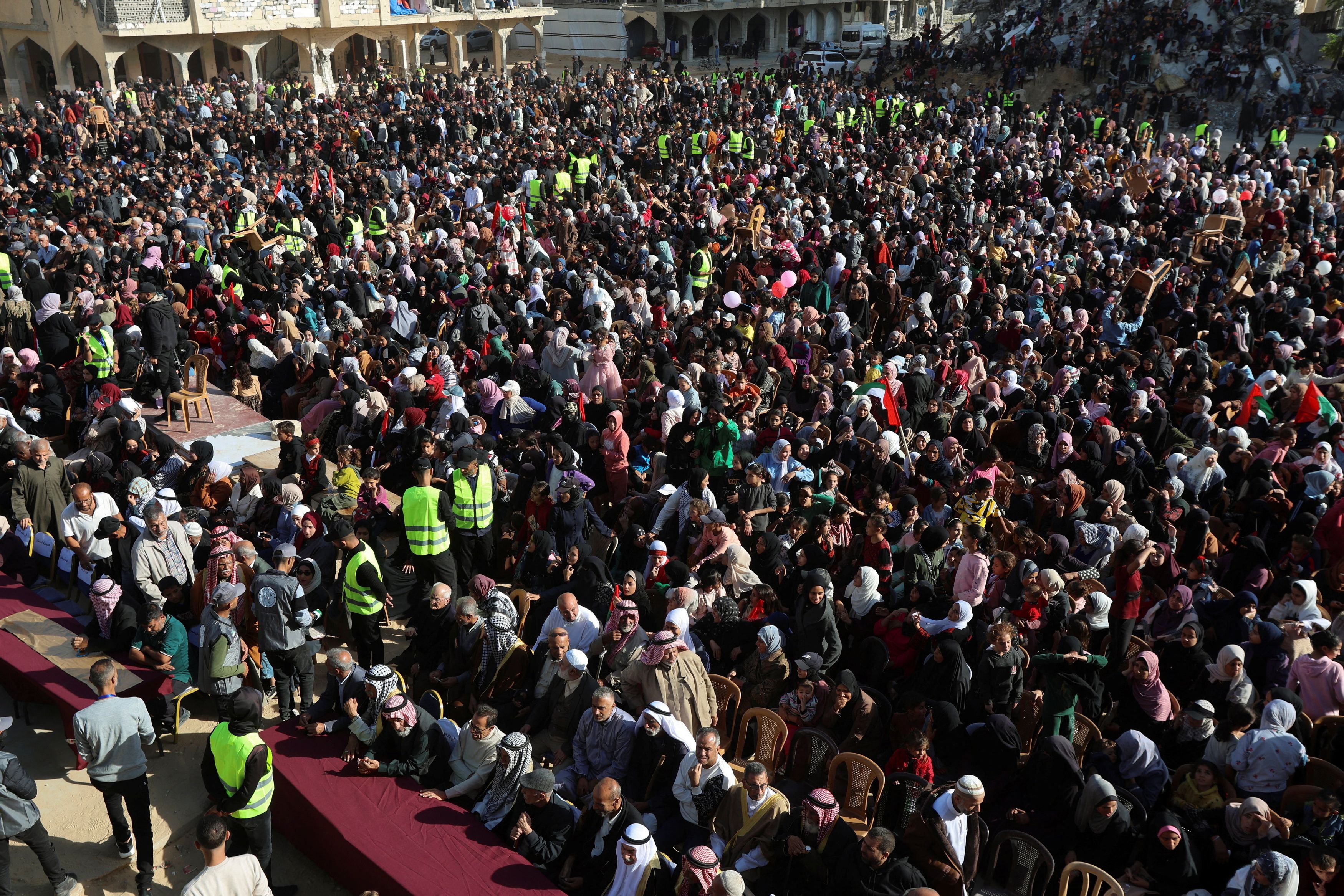 Την Τρίτη, μια πομπή αυτοκινήτων που μετέφερε τα ζευγάρια διέσχισε τμήματα κατεστραμμένων κτιρίων. Ο Χικμάτ και η Εμάν Λάουα κυμάτιζαν παλαιστινιακές σημαίες μαζί με άλλα ζευγάρια, ενώ οι οικογένειές τους χόρευαν υπό τους ήχους της μουσικής που αντηχούσε πάνω από το πλήθος.