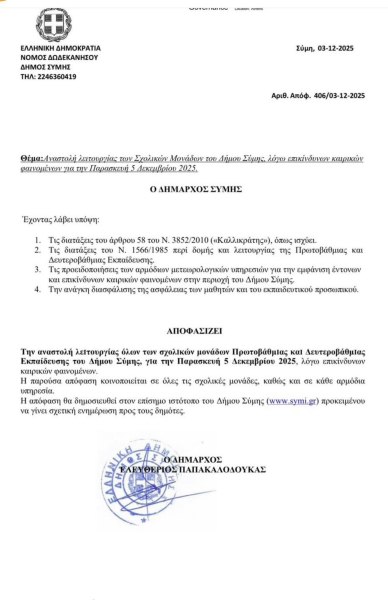 Με απόφαση του Δημάρχου Σύμης, Ελευθερίου Παπακαλοδούκα, θα ανασταλεί η λειτουργία όλων των σχολικών μονάδων του νησιού – τόσο της Πρωτοβάθμιας όσο και της Δευτεροβάθμιας Εκπαίδευσης – την Παρασκευή 5 Δεκεμβρίου 2025, εξαιτίας των έντονων και επικίνδυνων καιρικών φαινομένων που αναμένονται στην περιοχή.