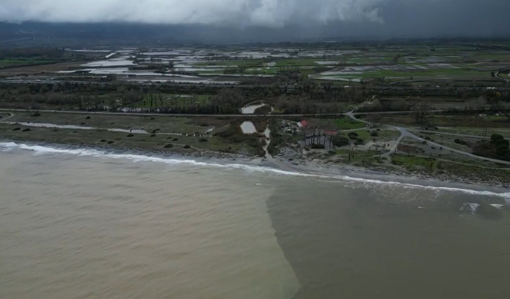 Όπως διακρίνεται στα πλάνα του Orange Press Agency, μεγάλες χερσαίες εκτάσεις έχουν μετατραπεί σε λίμνες λόγω των πλημμυρικών φαινομένων, ενώ η θαλάσσια περιοχή του Θερμαϊκού άλλαξε χρώμα.