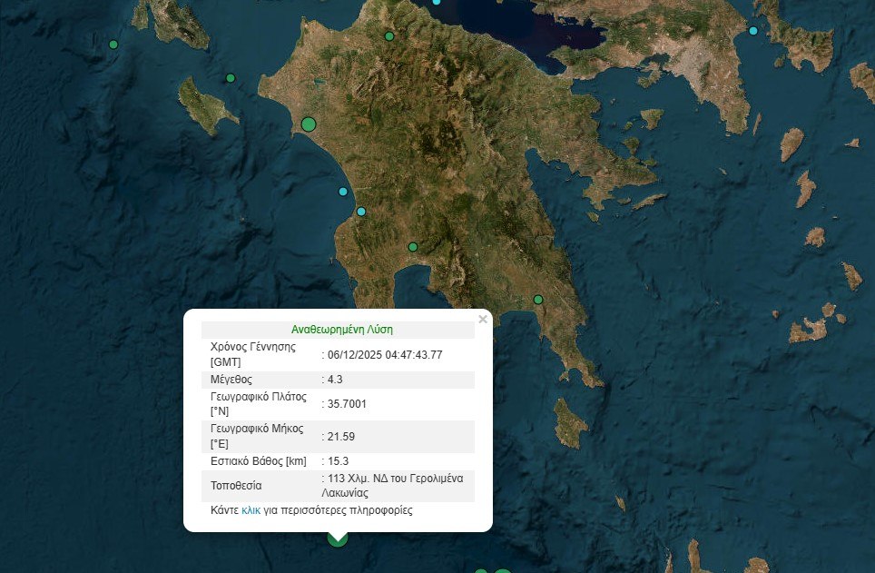 Σεισμός μεγέθους 4,3 βαθμών της κλίμακας Ρίχτερ σημειώθηκε τα ξημερώματα του Σαββάτου στη θαλάσσια περιοχή, ανοιχτά του Γερολιμένα Λακωνίας.