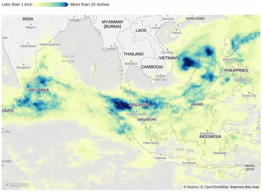 Παράλληλα, μια ψυχρή μάζα αέρα έφερε ισχυρούς ανέμους από βορρά πάνω από τη Θάλασσα της Νότιας Κίνας, συγκεντρώνοντας υγρασία που μετουσιώθηκε σε έντονες βροχές σε Ταϊλάνδη και Μαλαισία.