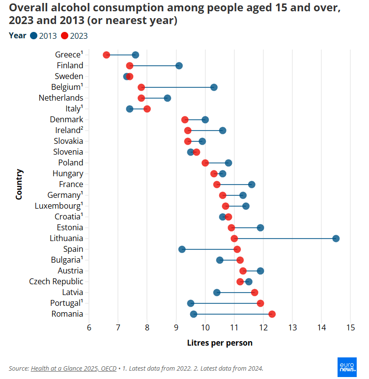 Μεταξύ 2013 και 2023, το Βέλγιο και η Λιθουανία κατέγραψαν τις μεγαλύτερες μειώσεις στην κατανάλωση αλκοόλ, με μείωση 2,5 λίτρων ή περισσότερο.