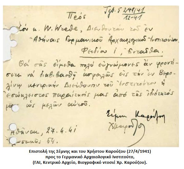 Η αρχαιολόγος Σέμνη Καρούζου (το γένος Παπασπυρίδη), σύζυγος του διακεκριμένου αρχαιολόγου Χρήστου Καρούζου, κατάφερε να διαγράψει αξιοπρόσεκτη πορεία στο επιστημονικό πεδίο όπου δραστηριοποιήθηκε επί πολλές δεκαετίες (χρόνος υπηρεσίας 1921-1964).