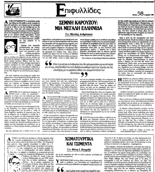 *Επιφυλλίδα του Μανόλη Ανδρόνικου, που έφερε τον τίτλο «Σέμνη Καρούζου: Μια μεγάλη Ελληνίδα» και είχε δημοσιευτεί στην εφημερίδα «Το Βήμα» την Κυριακή 9 Απριλίου 1989.