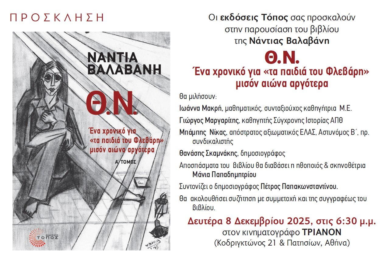 Το βιβλίο της Νάντιας Βαλαβάνη «ΘΝ. Ένα χρονικό για τα “παιδιά του Φλεβάρη” μισόν αιώνα αργότερα» θα παρουσιαστεί τη Δεύτερα 8 Δεκεμβρίου 2025, στις 6.30 μ.μ. στον κινηματογράφο Τριανόν (Κοδριγκτώνος 2 & Πατησίων, Αθήνα).