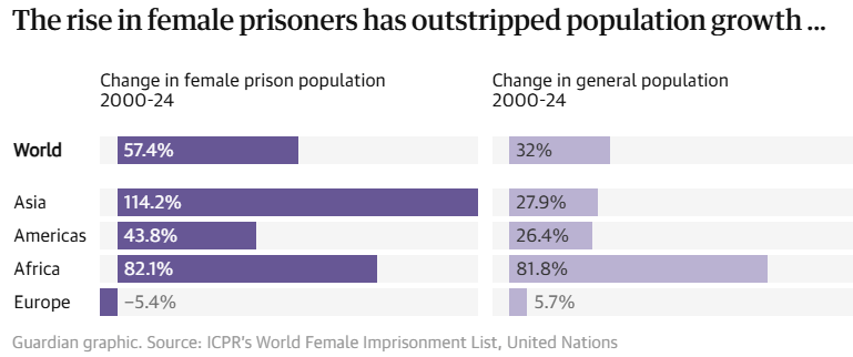 Ενώ οι γυναίκες αποτελούν μια μικρή μειοψηφία του συνολικού πληθυσμού των φυλακών — συνήθως μεταξύ 2% και 9% — το ποσοστό φυλάκισής τους έχει εκτοξευθεί στα ύψη.