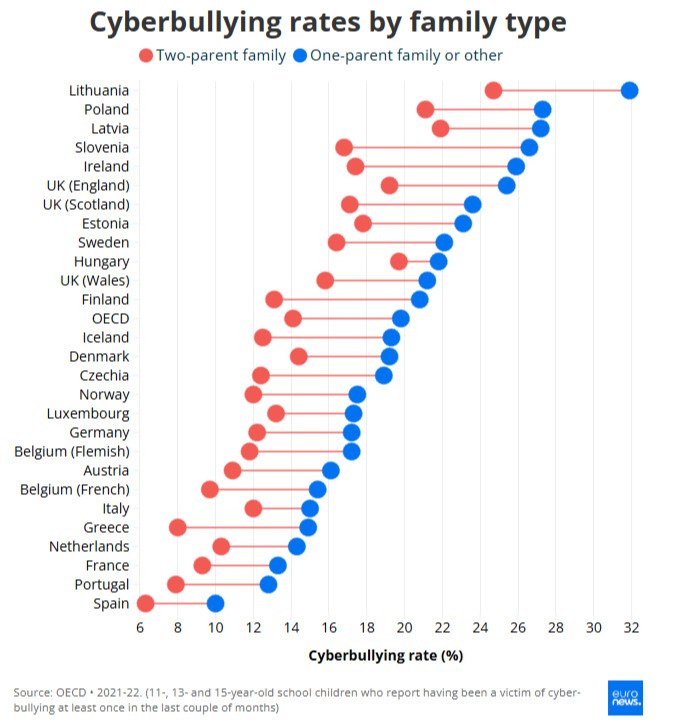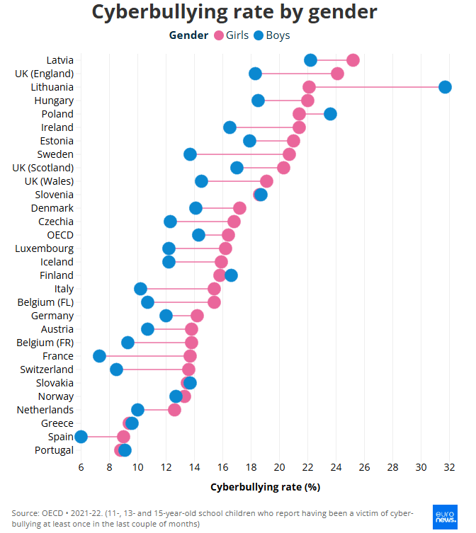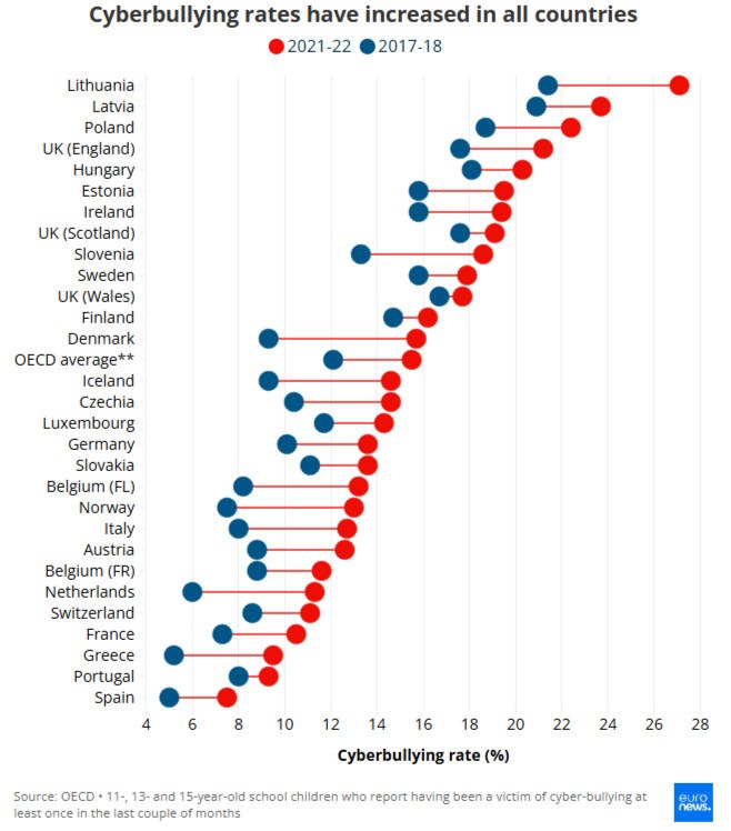 Τα στοιχεία του ΟΟΣΑ περιλαμβάνουν μαθητές ηλικίας 11, 13 και 15 ετών. Κατά την περίοδο 2021-22, το ποσοστό διαδικτυακού εκφοβισμού, που δείχνει το ποσοστό των παιδιών που υπέστησαν εκφοβισμό στο διαδίκτυο, κυμάνθηκε από 7,5% στην Ισπανία έως 27,1% στη Λιθουανία.