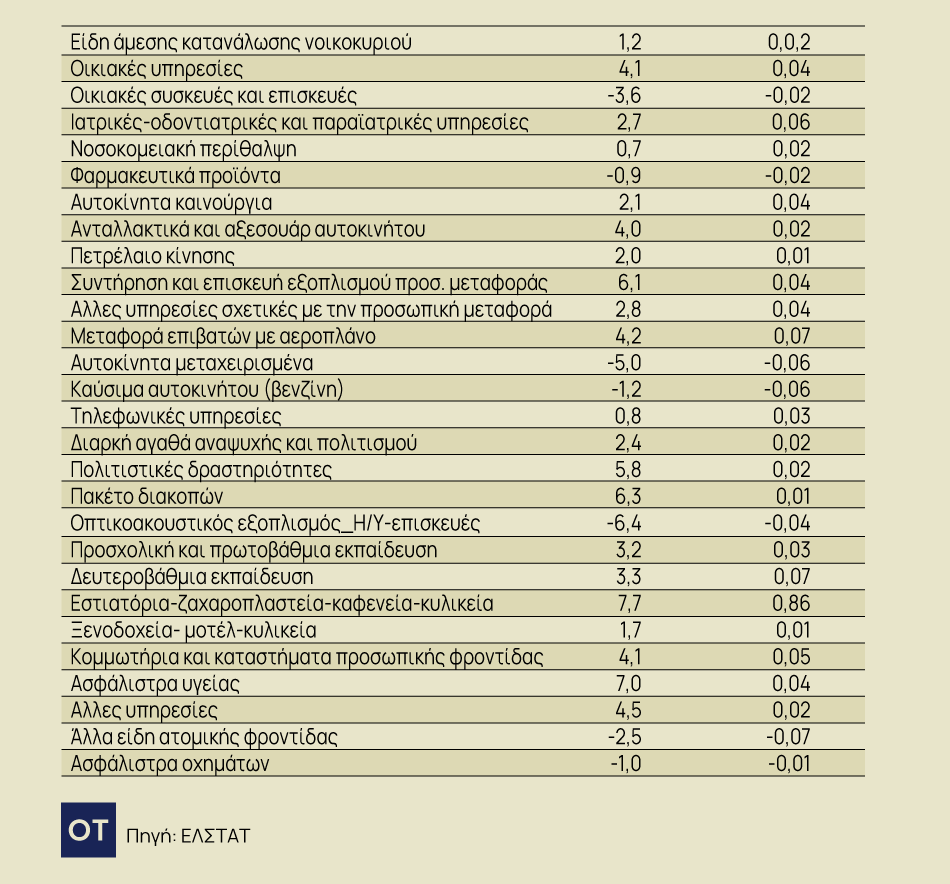 • 7,4% στην ομάδα Ξενοδοχεία-Καφέ-Εστιατόρια, λόγω αύξησης κυρίως των τιμών σε: εστιατόρια-ζαχαροπλαστεία-καφενεία κυλικεία, ξενοδοχεία-μοτέλ-πανδοχεία.