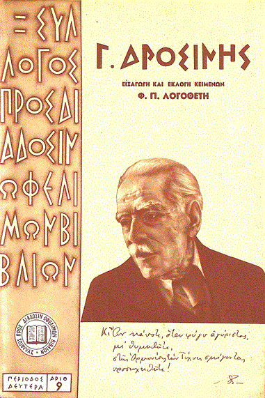 Δέκα χρόνια μετά τον θάνατο του Γεωργίου Δροσίνη, επήρα τις ημέρες αυτές στα χέρια μου την μικρή εκλογή (σ.σ. ανθολογία) των έργων του την οποία μας έδωσε ο «Σύλλογος προς Διάδοσιν Ωφελίμων Βιβλίων». Καλύτερο μνημόσυνο δεν μπορούσε να γίνει στον εκλεκτό και σεμνόν εκείνον λόγιο από μια τέτοια δημοσίευση, που ίσως αποτελέσει κίνητρο για κάτι πιο μεγάλο και πιο υπεύθυνο· εννοώ πρώτιστα την έκδοση των «Απάντων» του, για την οποία, επιτέλους, υπάρχουν και κάποιες σχετικές υποχρεώσεις, που πριν από ολίγα χρόνια είχαν απασχολήσει σοβαρά την Έδλα Νάζου. Κι αν το έργο τούτο, έστω και σε αραιά διαστήματα δοσμένο, φανερωνόταν ανώτερο από την αντοχή των Ελλήνων εκδοτών ή του ελληνικού αναγνωστικού κοινού, υπάρχει μια άλλη, πιο άμεση και ευκολώτερα εκτελεστή υποχρέωση: το δεύτερο μέρος από τα «Σκόρπια Φύλλα της Ζωής μου», του οποίου η έκδοση σε τόμο θα αποτελέσει πολύτιμη προσφορά στην μνήμη του ποιητή και, πιο γενικά, στα ελληνικά γράμματα. Είχα κι άλλες πρόσφατες αφορμές να τιμήσω την ανανεωμένη εκδοτική προσπάθεια του «Συλλόγου»· χαίρομαι που και σήμερα, όσο κι αν το καινούριο τούτο βιβλίο θα μπορούσε να προκαλέσει μερικές επιφυλάξεις σε έναν αυστηρό κριτή, μου παρέχεται και πάλι η ευκαιρία να σχολιάσω την δραστηριότητα του «Συλλόγου» και την συνεχιζόμενη έτσι συμβολή του στα πράγματα της νέας μας παιδείας.