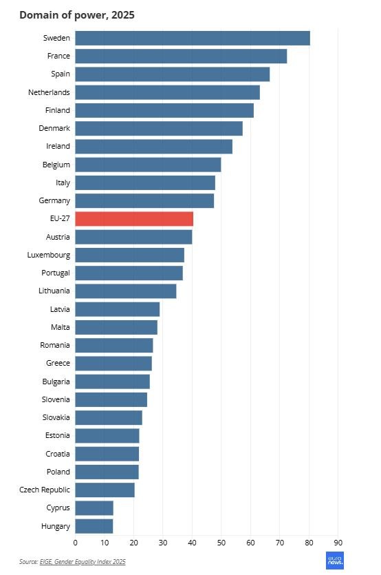 Σε ολόκληρη την ΕΕ, οι βαθμολογίες για την κατηγορία εξουσίας, η οποία μετρά την ισότητα ανδρών και γυναικών σε θέσεις λήψης αποφάσεων σε όλους τους πολιτικούς, οικονομικούς και κοινωνικούς τομείς, κυμαίνονται από το υψηλότερο επίπεδο των 80,3 μονάδων στη Σουηδία έως τους 12,9 βαθμούς στην Ουγγαρία.