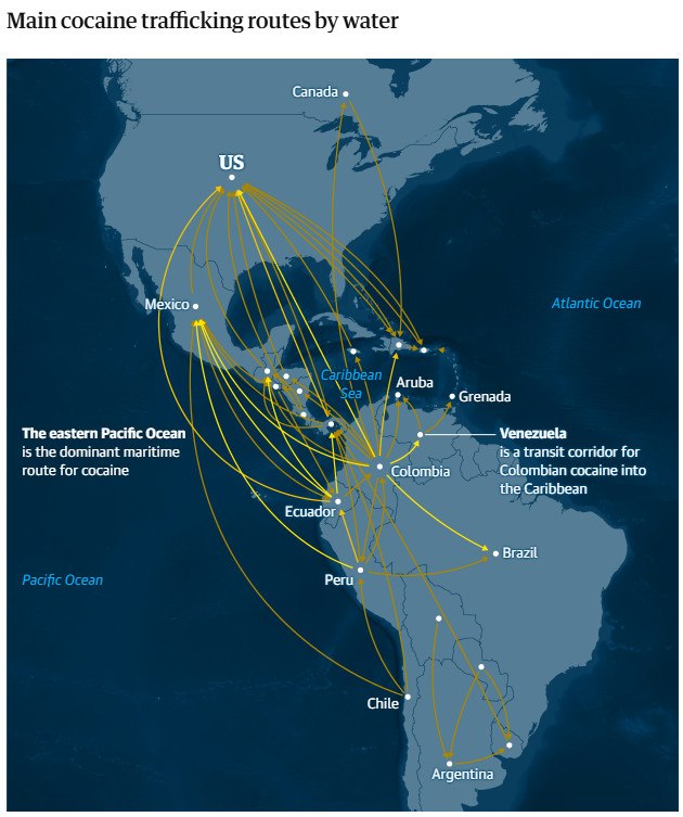 Κύριες οδοί διακίνησης κοκαΐνης μέσω θαλάσσης Γραφικό του Guardian. Πηγή: Γραφείο των Ηνωμένων Εθνών για τα Ναρκωτικά και το Έγκλημα, 2023-24. Σημείωση: ο χάρτης απεικονίζει τις ροές κοκαΐνης μεταξύ χωρών, όχι συγκεκριμένες οδούς, προέλευση ή προορισμούς. Τα χρώματα των βελών υποδηλώνουν την ένταση της ροής, με τα πιο σκούρα χρώματα να αντιπροσωπεύουν ισχυρότερες ενδείξεις διακίνησης κοκαΐνης, με βάση τον αριθμό των κατασχέσεων και όχι τον κατασχεθέντα όγκο.