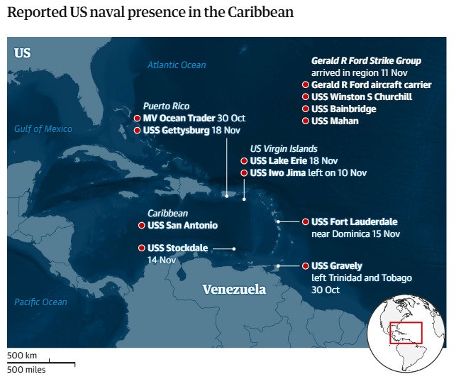 Τον Οκτώβριο, το Πεντάγωνο ανακοίνωσε ότι θα αναπτύξει επίσης το USS Gerald R Ford, το νεότερο και μεγαλύτερο αεροπλανοφόρο στον κόσμο, το οποίο έφτασε στην Καραϊβική στις 11 Νοεμβρίου με περισσότερους από 4.000 ναύτες, μαχητικά αεροσκάφη και συνοδευτικά πολεμικά πλοία.