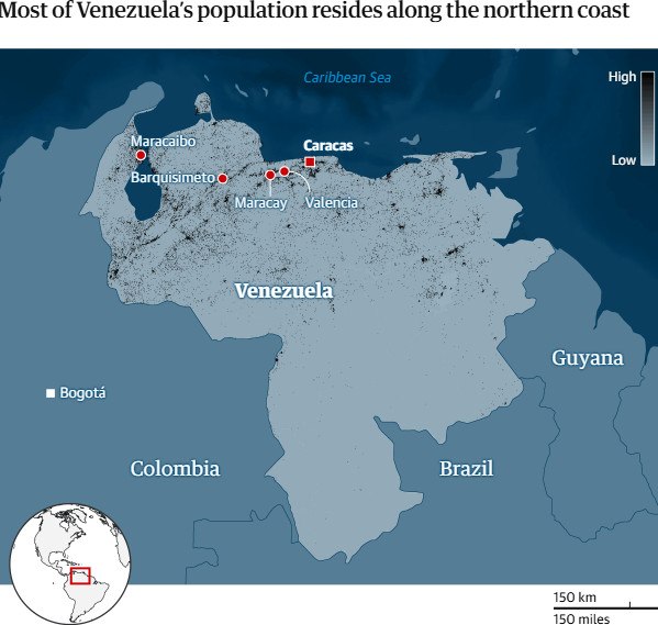 Το μεγαλύτερο μέρος του πληθυσμού της Βενεζουέλας κατοικεί κατά μήκος της βόρειας ακτής Γραφικό του Guardian. Πηγή: Εκτιμήσεις πυκνότητας πληθυσμού του WorldPop για το 2025, υπολογισμένες με βάση τον συνολικό αριθμό ατόμων ανά τετράγωνο πλέγματος 100 μέτρων.