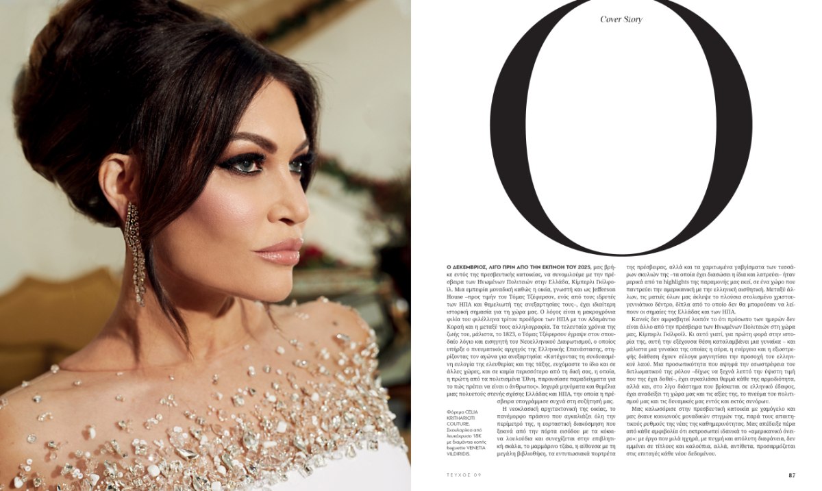 Στο εντυπωσιακό εξώφυλλο, η πρέσβειρα των ΗΠΑ στην Ελλάδα, Κίμπερλι Γκίλφοϊλ, φωτογραφίζεται για πρώτη φορά στην πρεσβευτική κατοικία στο Κολωνάκι, σε μια αποκλειστική φωτογράφιση για το Grace που αποτυπώνει τη δύναμη, την κομψότητα και τον σύγχρονο ρόλο της γυναίκας στον δημόσιο βίο.