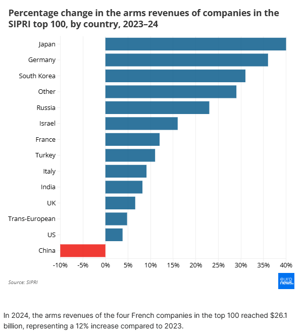 Το 2024, τα έσοδα από τα όπλα των τεσσάρων γαλλικών εταιρειών που βρίσκονται στις 100 κορυφαίες εταιρείες έφτασαν τα 26,1 δισεκατομμύρια δολάρια, σημειώνοντας αύξηση 12% σε σύγκριση με το 2023.
