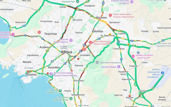 Στην Κηφισίας η κίνηση είναι αυξημένη στο ύψος του Χαλανδρίου στο ρεύμα προς Κηφισιά λόγω τροχαίου ατυχήματος στη συμβολή της με τη Λυκούργου. Αυξημένη κίνηση παρατηρείται στην Πέτρου Ράλλη στο ύψος της Θηβών, στην Αλεξάνδρας, στη Μεσογείων, στη Βασ. Κωνσταντίνου και στη Βουλιαγμένης.
