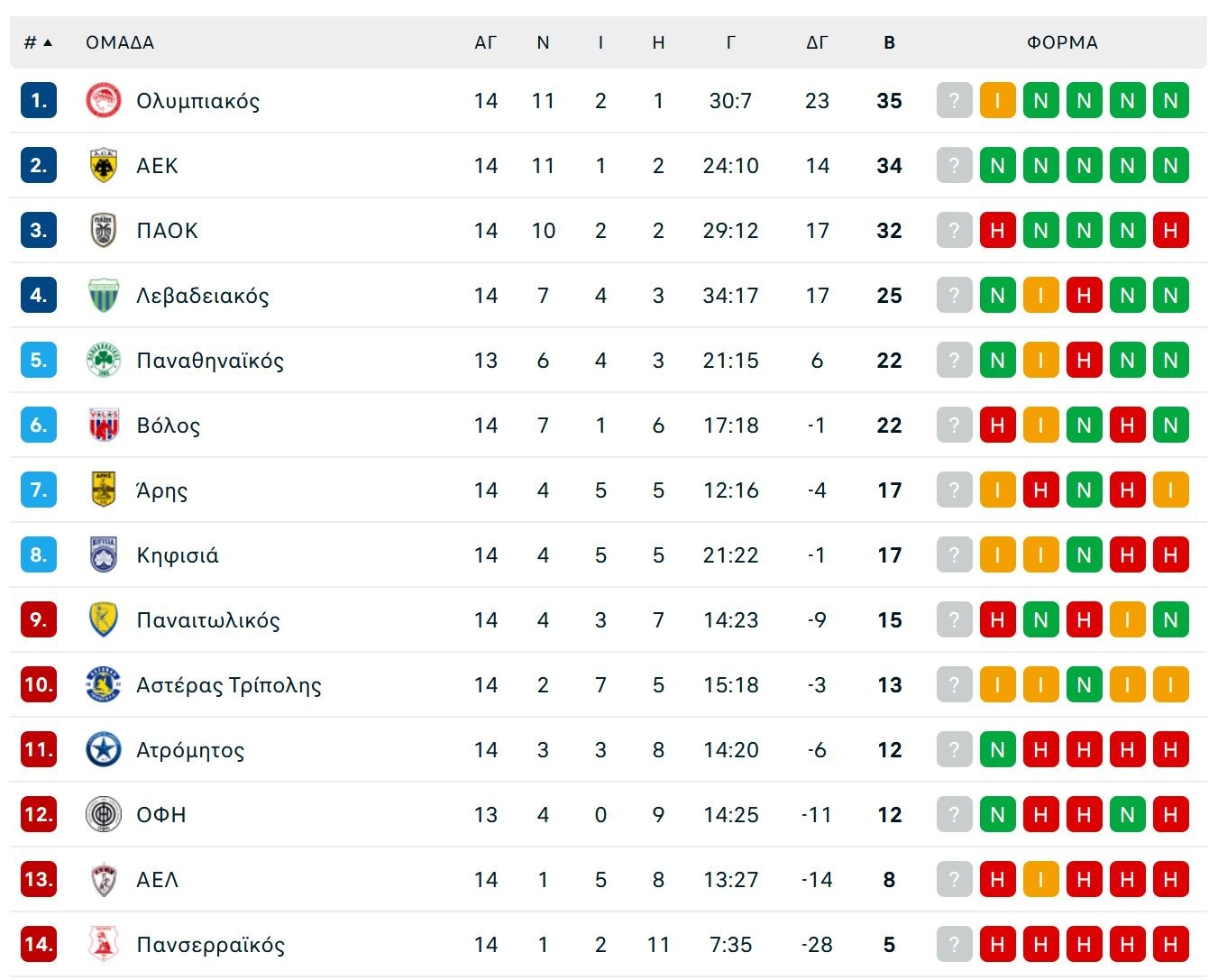 - Η βαθμολογία στη Super League μετά την ολοκλήρωση της 14ης αγωνιστικής