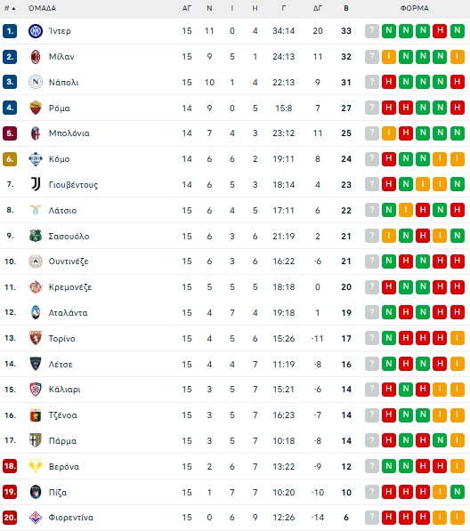 Τα αποτελέσματα και το πρόγραμμα της 15ης αγωνιστικής της Serie A: