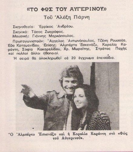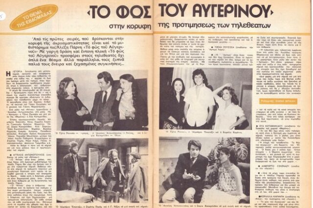 ΕΡΤ 1980-1981, «Το φως του Αυγερινού». Το σήριαλ είχε φοβερή επιτυχία και οι περισσότεροι θυμόμαστε το βράδυ της 24ης Φεβρουαρίου 1981 την ώρα που το παρακολουθουσαμε οικογενειακώς κι έγινε ο μεγάλος σεισμός Αθηνα και Κορινθία με επίκεντρο τις Αλκυονίδες.