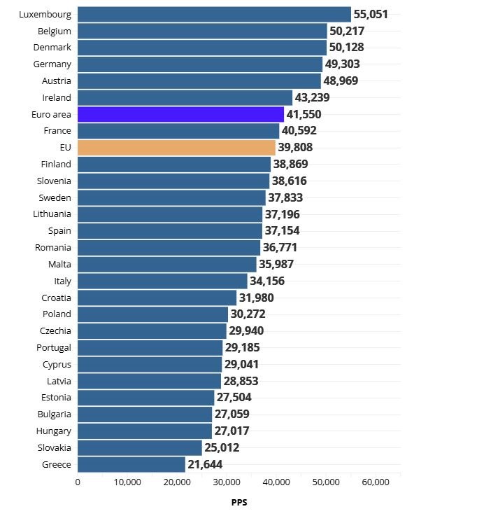 Ο μέσος ετήσιος μισθός ανά εργαζόμενο στην ΕΕ είναι 39.808 ευρώ. Μεταξύ των χωρών της ΕΕ, κυμαίνεται από 15.387 ευρώ στη Βουλγαρία έως 82.969 ευρώ στο Λουξεμβούργο, που είναι 5,4 φορές υψηλότερος.