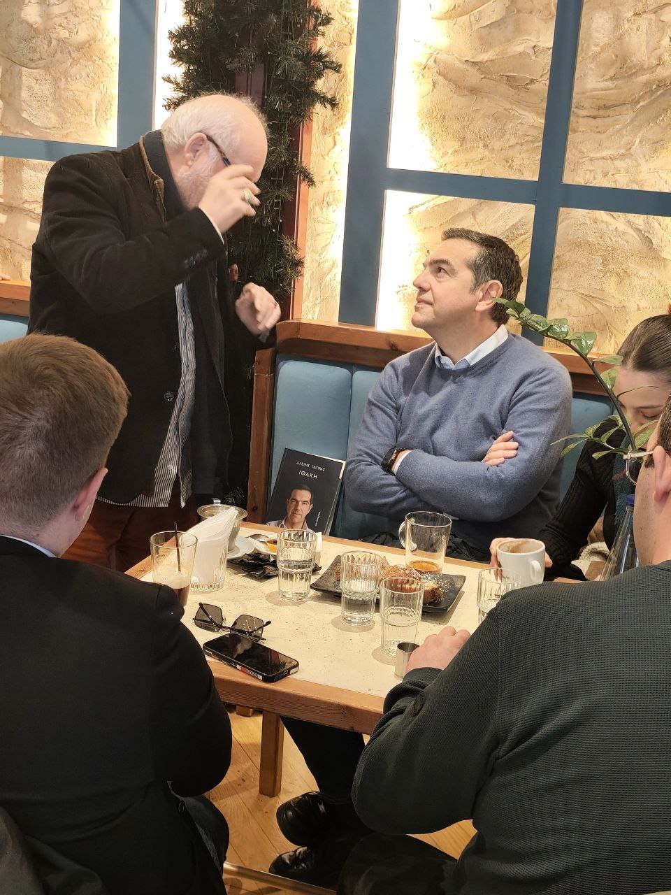 Μάλιστα πολλοί έμαθαν ότι είναι στο συγκεκριμένο καφέ με τους νέους και ήρθαν με την Ιθάκη στο χέρι για τους γράψει αφιέρωση.