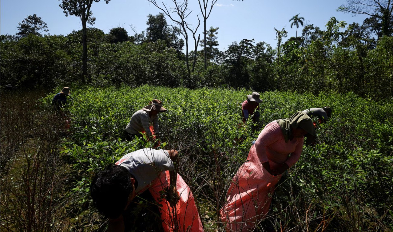 Η επιφάνεια στην οποία εκτείνονται καλλιέργειες κόκας στη Βολιβία, τη χώρας η οποία κατατάσσεται τρίτη στον κόσμο ως προς την παραγωγή κοκαΐνης, μεγεθύνθηκε κατά 10% την περίοδο μεταξύ του 2023 και του 2024, σύμφωνα με δεδομένα που δημοσιοποιήθηκαν χθες Δευτέρα από το Γραφείο των Ηνωμένων Εθνών για τον Eλεγχο των Ναρκωτικών και την Πρόληψη του Εγκλήματος – ONUDC (στη φωτογραφία του Reuters/Agustin Marcarian, επάνω, εργάτες γης μαζεύουν φύλλα κόκας στην Ετεραζάμα της Βολιβίας).