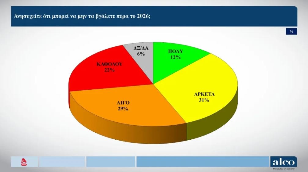 Σύμφωνα με την ίδια δημοσκόπηση, το 31% δηλώνει ότι «ανησυχεί αρκετά» ότι μπορεί να μην τα βγάλει πέρα το 2026, το 29% «ανησυχεί λίγο», το 12% τονίζει ότι «ανησυχεί πολύ», εν το 22% «δεν ανησυχεί καθόλου».