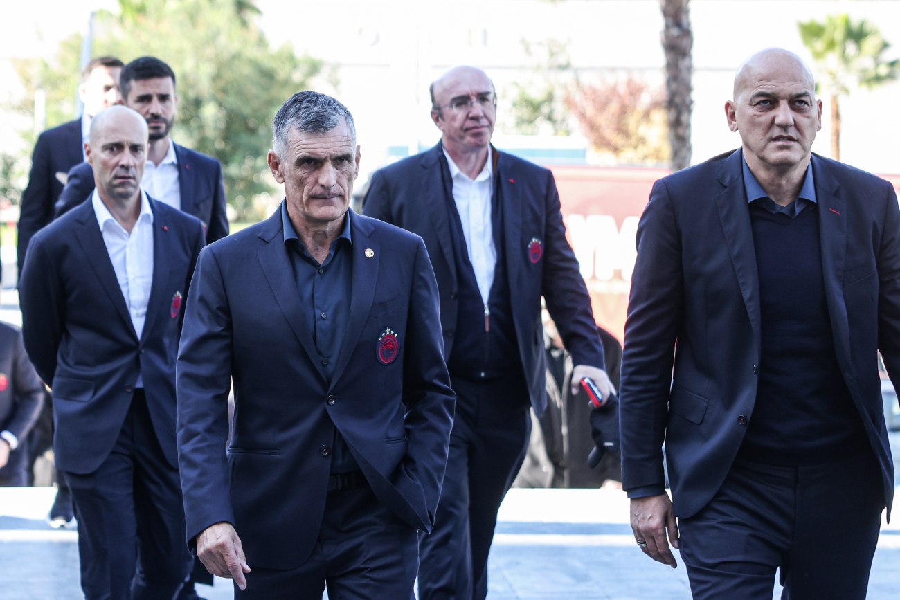 Ο προπονητής του Ολυμπιακού, Χοσέ Λουίς Μεντιλίμπαρ, ο αθλητικός διευθυντής Ντάρκο Κοβάσεβιτς και στελέχη του προπονητικού επιτελείου.