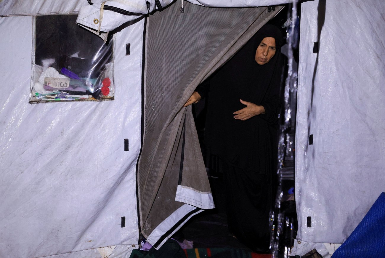 Εκτοπισμένη Παλαιστίνια βρίσκει καταφύγιο σε πλημμυρισμένο καταυλισμό σκηνών, μια βροχερή ημέρα στην Πόλη της Γάζας, 15 Δεκεμβρίου 2025. REUTERS/Dawoud Abu Alkas