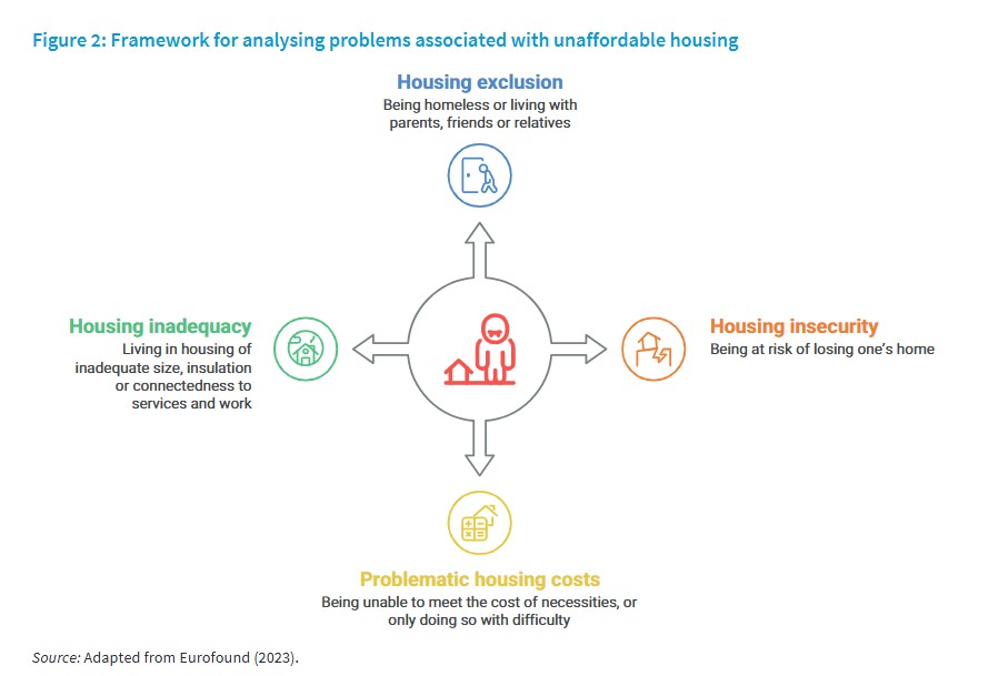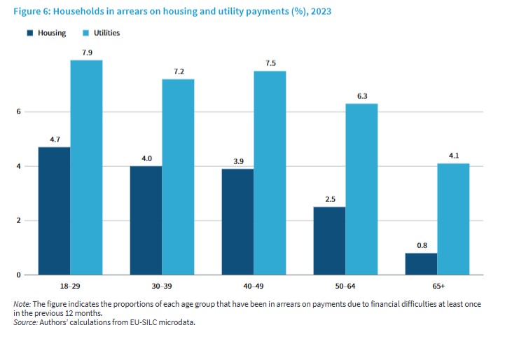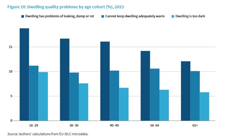 Οι νέοι που δαπανούν μεγάλο μέρος του εισοδήματός τους για ενοίκιο ή ζουν σε επισφαλείς στεγαστικές συνθήκες αναφέρουν χαμηλότερη ποιότητα ζωής και μειωμένη ψυχική ευεξία. Η εν λόγω έκθεση αναφέρει ότι ιδίως οι νέοι της ηλικιακής ομάδας 18-29 ετών είναι πιο πιθανό να έχουν καθυστερήσεις στις πληρωμές στέγασης και λογαριασμών κοινής ωφέλειας.