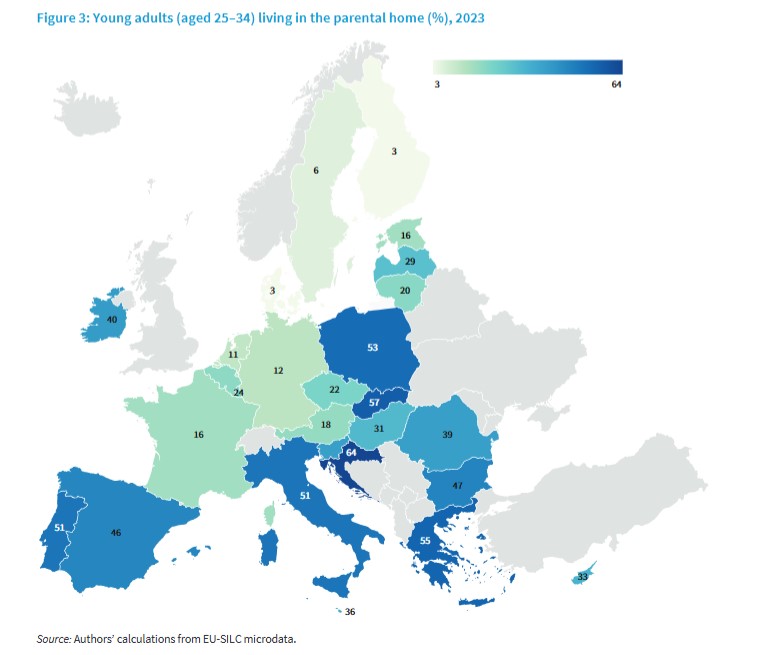 Στην ηλικιακή ομάδα 25–34 ετών στο σύνολο της ΕΕ, περίπου 30% εξακολουθεί να ζει με τους γονείς του. Ωστόσο, στα σκανδιναβικά κράτη-μέλη, το ποσοστό κυμαίνεται μεταξύ 3% και 6%, ενώ σε αρκετά κράτη-μέλη της ΕΕ περισσότερο από το ήμισυ του πληθυσμού αυτής της ηλικιακής ομάδας ζει στο πατρικό.