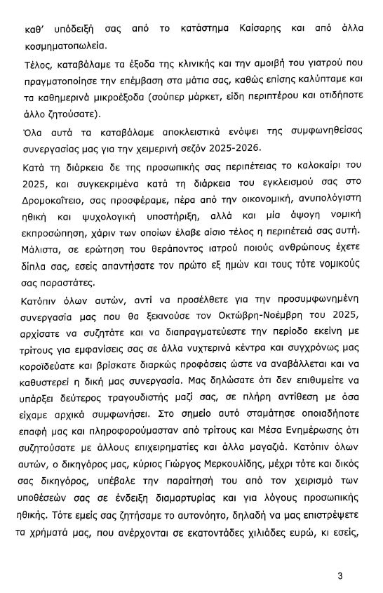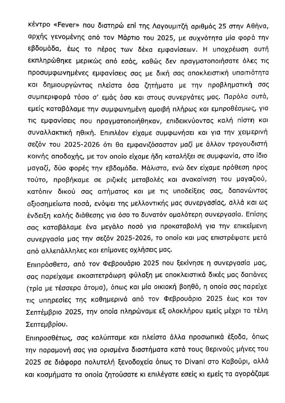 Επιπλέον, στο εξώδικο περιγράφεται ότι από τον Φεβρουάριο του 2025 καλύφθηκαν αποκλειστικά από την επιχείρηση έξοδα που αφορούσαν 24ωρη φύλαξη, παροχή οικιακής βοηθού για καθημερινή υποστήριξη, καθώς και πληθώρα προσωπικών δαπανών, όπως διαμονές σε ξενοδοχεία, αγορές κοσμημάτων, ιατρικά έξοδα και άλλες καθημερινές ανάγκες. Όπως τονίζεται, οι παροχές αυτές έγιναν στο πλαίσιο και ενόψει της συμφωνημένης συνεργασίας για την επόμενη καλλιτεχνική σεζόν.