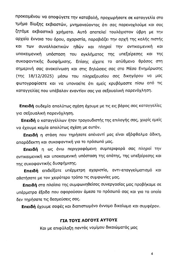 Παράλληλα, κατηγορεί τον γνωστό τραγουδιστή ότι, αρνούμενος να καταβάλει τα χρήματα που του ζητήθηκαν, προχώρησε σε καταγγελία στο Τμήμα Δίωξης Εκβιαστών, υποστηρίζοντας ότι δέχεται παρενόχληση και εκβιαστικές πιέσεις.