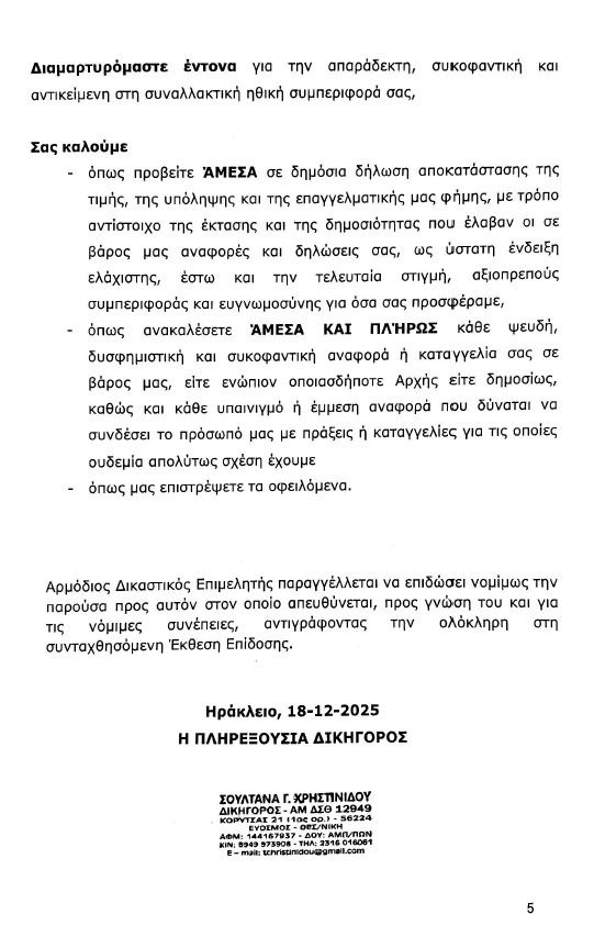 Τέλος, σύμφωνα με το εξώδικο, ο επίχειρηματίας καλεί τον Γιώργο Μαζωνάκη να προχωρήσει άμεσα σε δημόσια δήλωση αποκατάστασης της τιμής και της επαγγελματικής του φήμης, να ανακαλέσει κάθε δυσφημιστική αναφορά ή υπαινιγμό και να επιστρέψει τα ποσά που, όπως υποστηρίζεται, οφείλονται, επιφυλασσόμενος για την άσκηση κάθε νόμιμου δικαιώματός του.