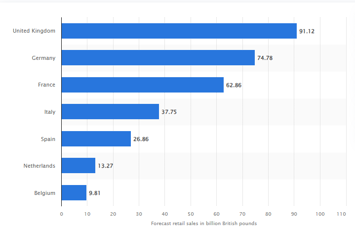 Εκτιμώμενες συνολικές χριστουγεννιάτικες δαπάνες στον τομέα του λιανικού εμπορίου στην Ευρώπη (διαδικτυακά και σε καταστήματα) το 2025, ανά χώρα Πηγή: Statista