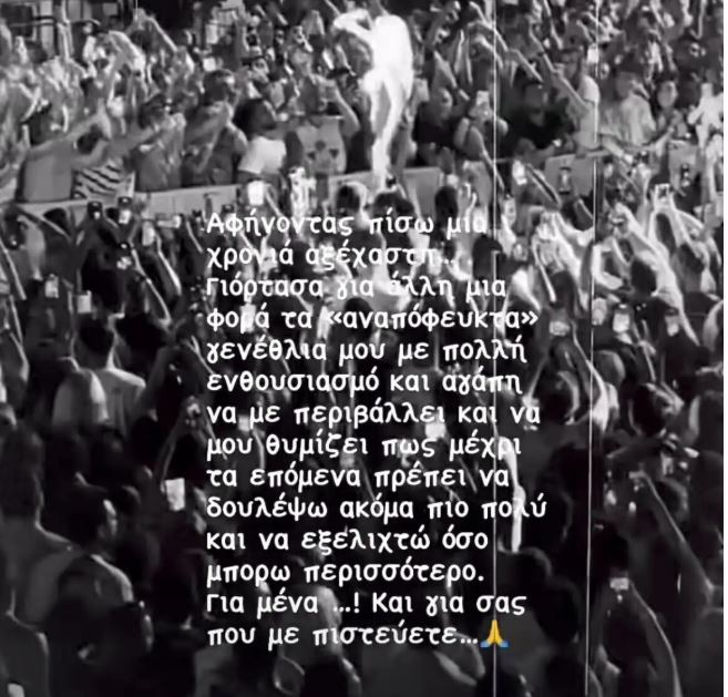 «Αφήνοντας πίσω μια χρονιά αξέχαστη. Γιόρτασα για άλλη μια φορά τα «αναπόφευκτα» γενέθλια μου με πολύ ενθουσιασμό και αγάπη να με περιβάλλει και να μου θυμίζει πως μέχρι τα επόμενα πρέπει να δουλέψω ακόμη πιο πολύ και να εξελιχτώ όσο μπορώ περισσότερο. Για μένα! Και για εσάς που με πιστεύετε».
