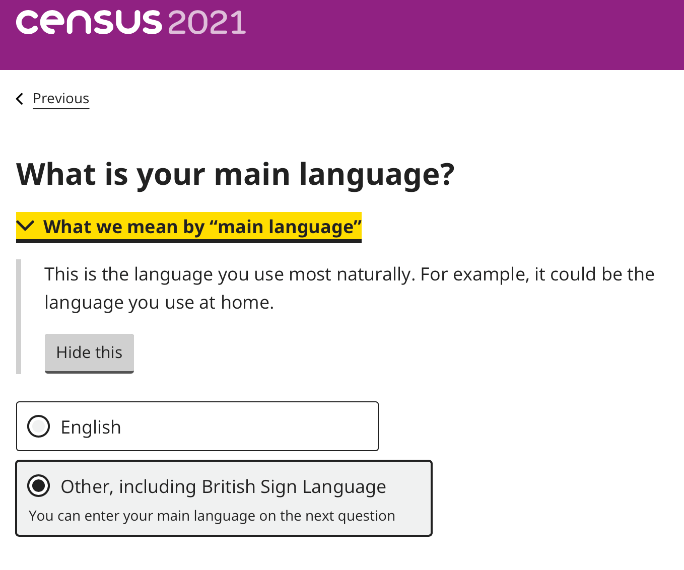 Σε μια προσπάθεια αποσαφηνισμού της έννοιας της «κύριας» γλώσσας, το Γραφείο Εθνικής Στατιστικής πρόσθεσε στο ερωτηματολόγιο του 2021 την εξής διευκρίνιση: «Είναι η γλώσσα που χρησιμοποιείτε με τον πιο φυσικό τρόπο. Για παράδειγμα, θα μπορούσε να είναι η γλώσσα που χρησιμοποιείτε στο σπίτι.» (‘This is the language you use most naturally. For example, it could be the language you use at home.’). Ωστόσο, η γλώσσα που ένας άνθρωπος θεωρεί «κύρια», η γλώσσα στην οποία νιώθει ότι εκφράζεται πιο φυσικά και η γλώσσα που χρησιμοποιεί στο σπίτι δεν είναι απαραίτητο να ταυτίζονται. Είναι λοιπόν πιθανό η διευκρίνιση, παρά την πρόθεσή της, να λειτούργησε σε ορισμένες περιπτώσεις αποπροσανατολιστικά με αποτέλεσμα αρκετά άτομα που μιλούν Ελληνικά να δηλώσουν τα Αγγλικά ή κάποια άλλη γλώσσα ως «κύρια» για τους σκοπούς της απογραφής και γενικά να υπο-αντιπροσωπεύεται συνολικά η πολυγλωσσία της Αγγλίας και της Ουαλίας στα ευρήματα των απογραφών.