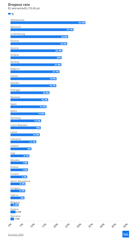Η Ολλανδία βρίσκεται στην κορυφή της κατάταξης, με περίπου έναν στους τρεις (32%) μαθητές να έχουν εγκαταλείψει πρόωρα την εκπαίδευση. Ακολουθεί η Δανία με 27%, ενώ το Λουξεμβούργο βρίσκεται στην τρίτη θέση με 25%.