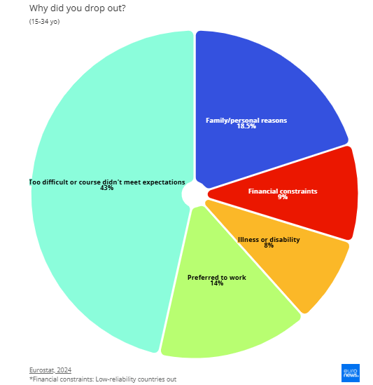 Τα στοιχεία της Eurostat δείχνουν ότι η συντριπτική πλειοψηφία (43 %) των παραιτήσεων συμβαίνει όταν οι μαθητές συνειδητοποιούν ότι τα μαθήματα ή η σχολή που επέλεξαν είναι πολύ δύσκολα ή δεν ανταποκρίνονται στις προσδοκίες τους, ποσοστό που αυξάνεται στο 50 % στις μεταδευτεροβάθμιες σπουδές.