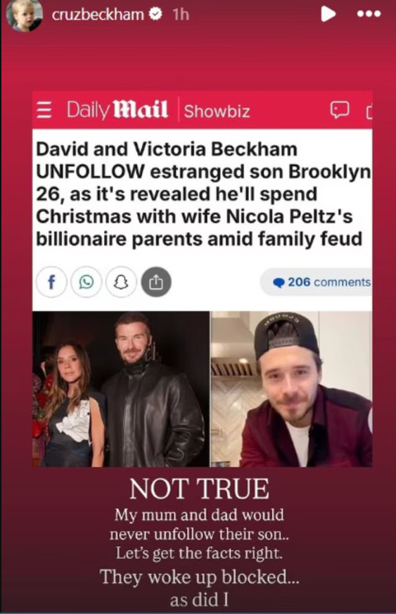 Με μια αιχμηρή ανάρτηση, ο 20χρονος Κρουζ Μπέκαμ διαψεύδει δημοσίευμα της Daily Mail που θέλει τους γονείς του, Ντέιβιντ και Βικτόρια, να έκαναν unfollow τον πρωτότοκο της οικογένειας Μπρούκλιν.