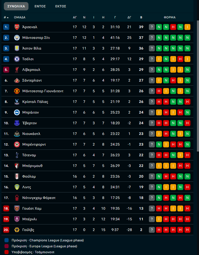 H βαθμολογία στην Premier League