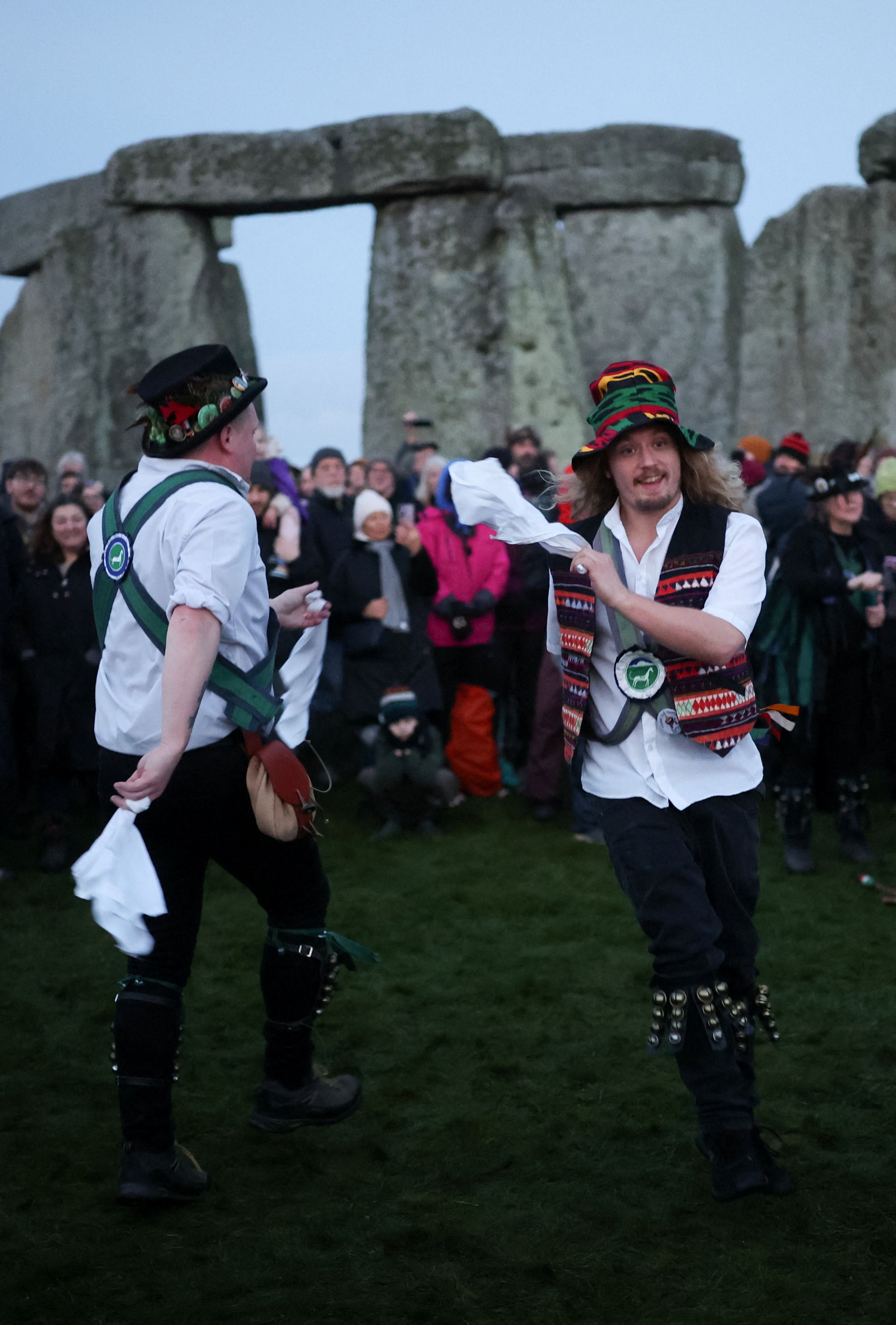 Τα πλήθη μαζεύτηκαν μέσα στο σκοτάδι γύρω από την ιστορική τοποθεσία για να παρακολουθήσουν την ανατολή του ηλίου, με ορισμένους ντυμένους με παραδοσιακά παγανιστικά ενδύματα.
