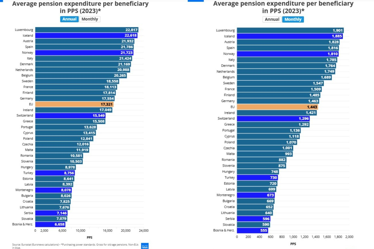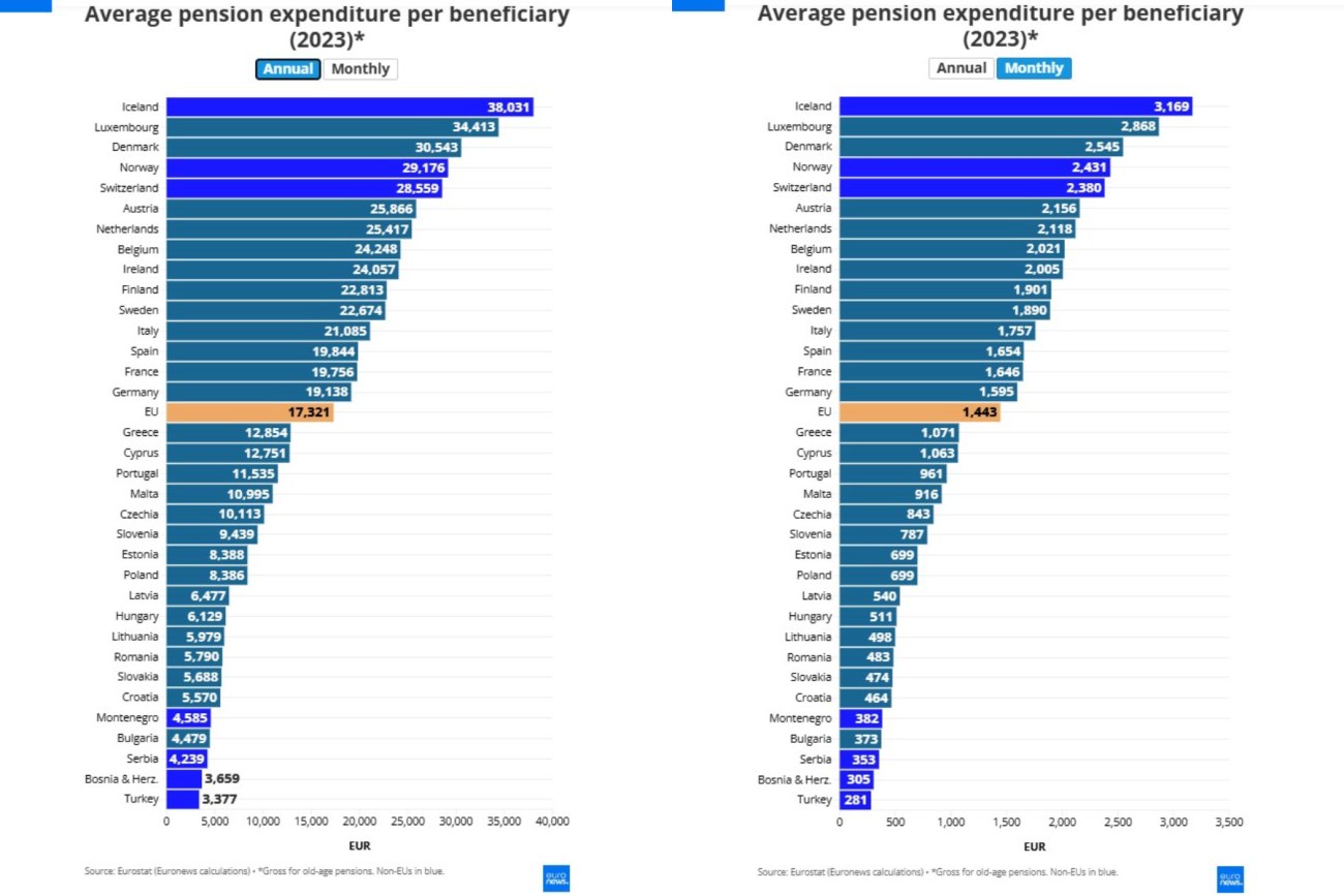 Μεταξύ 34 χωρών σε ολόκληρη την Ευρώπη, η μέση ετήσια σύνταξη ξεκινάει από 3.377 ευρώ στην Τουρκία και εκτοξεύεται στα 38.031 ευρώ στην Ισλανδία. Στα κράτη-μέλη της ΕΕ, τα ποσά κυμαίνονται από 4.479 ευρώ στη Βουλγαρία έως 34.413 ευρώ στο Λουξεμβούργο.