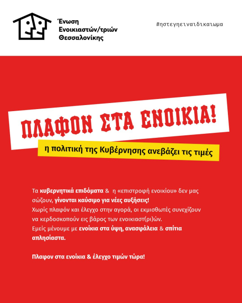 «Ζητάμε πλαφόν στις αυξήσεις των τιμών ενοικίων με βάση αντικειμενικά κριτήρια, όπως είναι η παλαιότητα του ακινήτου, η τοποθεσία, η ενεργειακή του κλάση κλπ. με βάση το μοντέλο της Ολλανδίας και μακροπρόθεσμα ένα πραγματικό απόθεμα κοινωνικής κατοικίας. Όχι με ‘’δωράκια’’ στον κατασκευαστικό κλάδο, αλλά ένα απόθμεα που θα βρίσκεται υπό κοινωνικό έλεγχο και θα παραχωρείται με βάση τις κοινωνικές ανάγκες και όχι τις τιμές της αγοράς».