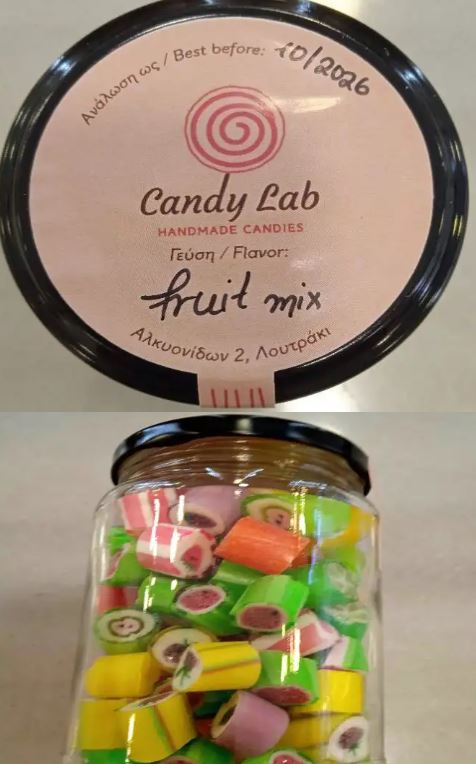 -Καραμέλες «fruit mix» με ημερομηνία ανάλωσης ως 10/2026, συσκευασίας καθαρού βάρους περίπου 230 γρ., το οποίο παράγεται και συσκευάζεται στην Ελλάδα από την «Candy Lab» που εδρεύει στο Λουτράκι Κορινθίας.