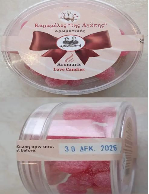 -Καραμέλες «της Αγάπης-Αρωματικές» με ημερομηνία ανάλωσης πριν από τις 30 Δεκ. 2026, συσκευασίας καθαρού βάρους περίπου 110 γρ. της εταιρείας με διακριτικό τίτλο «αρκαδιανή» που εδρεύει στο Ψάρι Αρκαδίας.