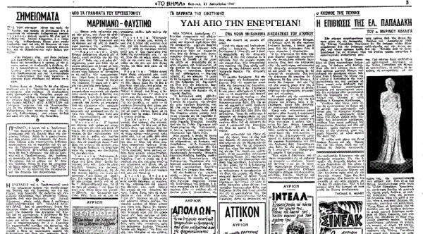 *Κείμενο του διαπρεπούς ιστορικού τέχνης και βυζαντινολόγου Μαρίνου Καλλιγά (1906-1985), που έφερε τον τίτλο «Η επιβίωσις της Ελ. Παπαδάκη» και είχε δημοσιευτεί στην εφημερίδα «Το Βήμα» την Κυριακή 21 Δεκεμβρίου 1947, με αφορμή τη συμπλήρωση τριών ετών από τη δολοφονία της Ελένης Παπαδάκη.