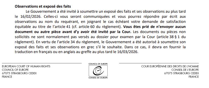 Αναφέρει επίσης ότι η προσφυγή, σύμφωνα με τον Αντιπρόεδρο του Τρίτου Τμήματος του ΕΔΔΑ θα μπορούσε ενδεχομένως να εμπίπτει στην «κύρια» κατηγορία. Σημειώνει ότι η προσφυγή θα έχει προτεραιότητα και πως η ελληνική κυβέρνηση έχει κληθεί να υποβάλει έκθεση των γεγονότων και τις παρατηρήσεις της το αργότερο έως τις 16 Φεβρουαρίου 2026. Και πως επί αυτών θα ενημερωθεί και θα μπορεί να απαντήσει και ο προσφεύγων.