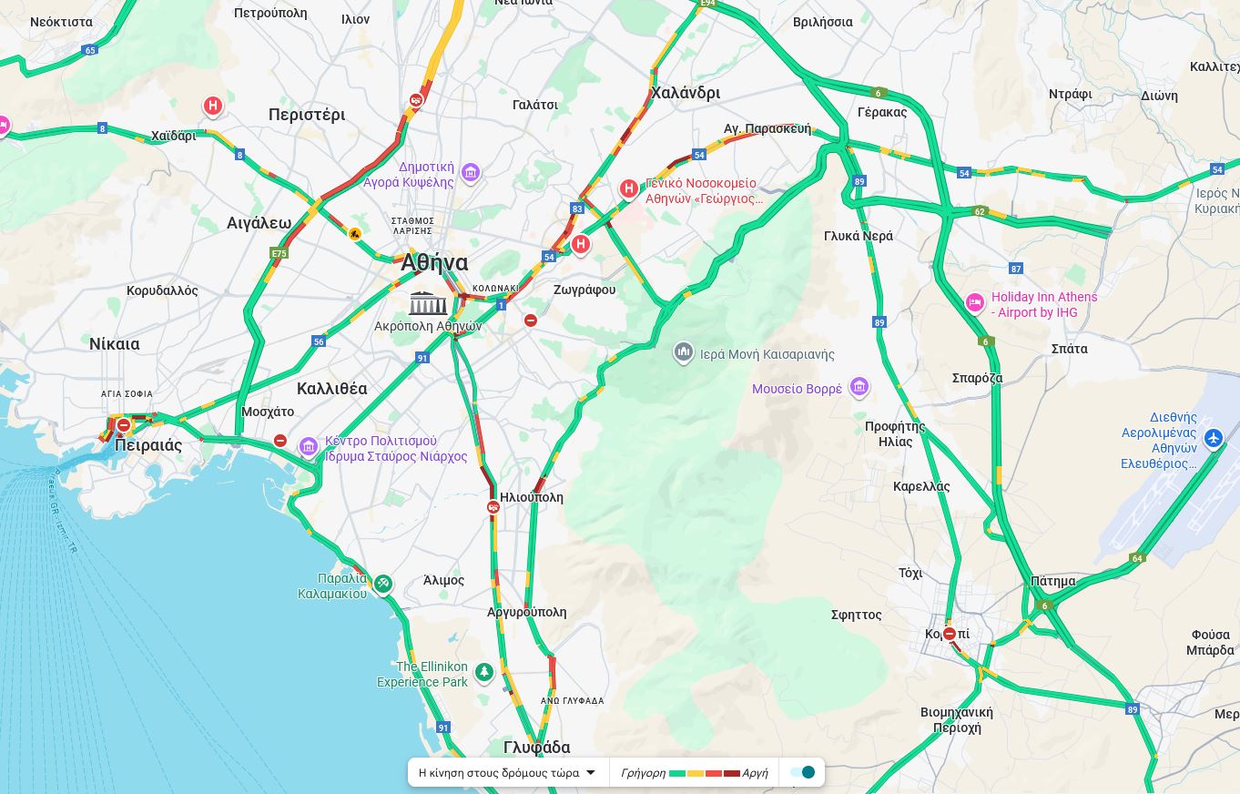 Στο κέντρο της Αθήνας, η κυκλοφορία διεξάγεται με χαμηλές ταχύτητες σε βασικούς οδικούς άξονες, όπως οι λεωφόροι Βασιλέως Κωνσταντίνου και Βασιλίσσης Σοφίας, καθώς και στην οδό Αρδηττού.
