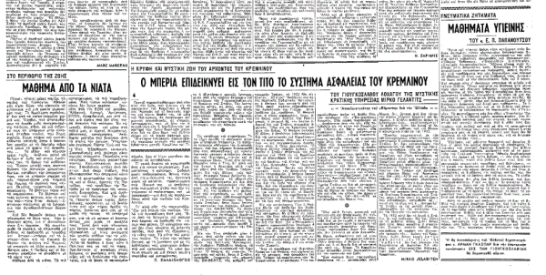 *Άρθρο που ήταν αφιερωμένο στον Λαβρέντι Μπέρια και στο σύστημα ασφαλείας του Κρεμλίνου επί Στάλιν. Συντάκτης του κειμένου, που είχε δημοσιευτεί στην εφημερίδα «Το Βήμα» την Πέμπτη 21 Δεκεμβρίου 1950, ήταν ο λοχαγός της μυστικής κρατικής υπηρεσίας της Γιουγκοσλαβίας Μίρκο Γέλαντιτς (Mirko Jeladitch).